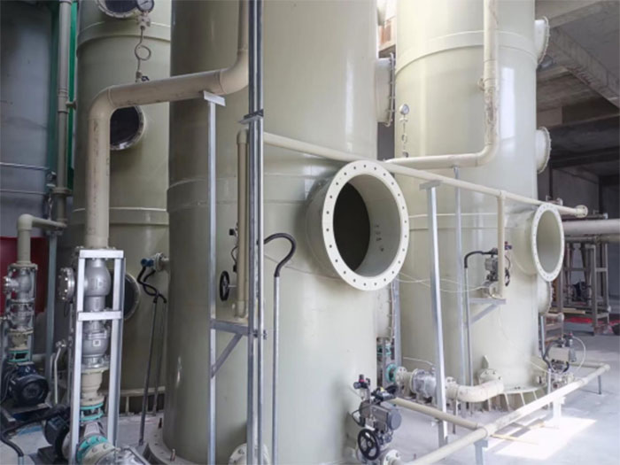 該系統(tǒng)的吸收塔采用FRP。塔體具備煙氣進(jìn)出口、人孔門、檢查門、法蘭、液位控制、溢流管及所有需要的連接件等。選用的材質(zhì)能避免氣體中氣體的腐蝕,塔內(nèi)所有部件能承受最大入口氣流的沖擊,設(shè)計(jì)溫度范圍氣體對(duì)任何系統(tǒng)和設(shè)備不造成損害,所有部件包括塔體和內(nèi)部結(jié)構(gòu)設(shè)計(jì)均考慮腐蝕余度;塔體的設(shè)計(jì)保證煙氣流的均勻,盡可能避免形成死角;塔殼體能承受壓力荷載、管道力和力矩、風(fēng)載等其他所有在塔上的荷載。玻璃鋼材制作為耐蝕設(shè)備廣泛應(yīng)用于化工、冶金和電子等領(lǐng)域。既經(jīng)濟(jì)耐用,減少了設(shè)備維護(hù),又延長(zhǎng)了使用壽命,具有優(yōu)越的性能。
